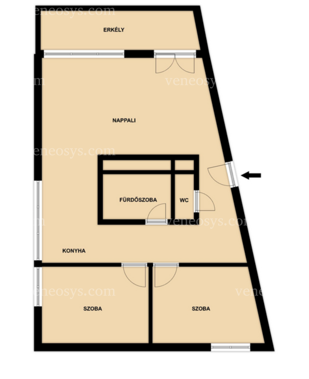 Mieszkanie o powierzchni 81 m2 znajduje się na piątym piętrze; składa się z przestronnego salonu z w pełni wyposażonym aneksem kuchennym oraz dwóch sypialni i łazienki. Posiada balkon, z którego można się zachwycać panoramą Wzgórza Zamkowego i Góry Gellerta. Nieruchomość wyposażono w nowoczesny system centralnego ogrzewania, klimatyzację, nowe okna z roletami.