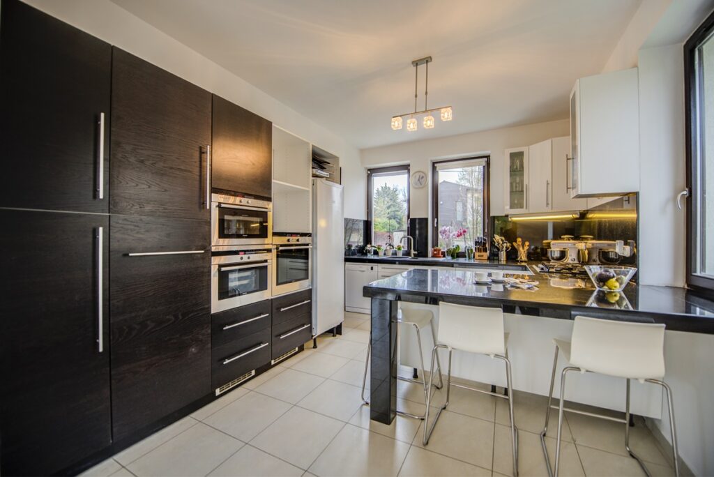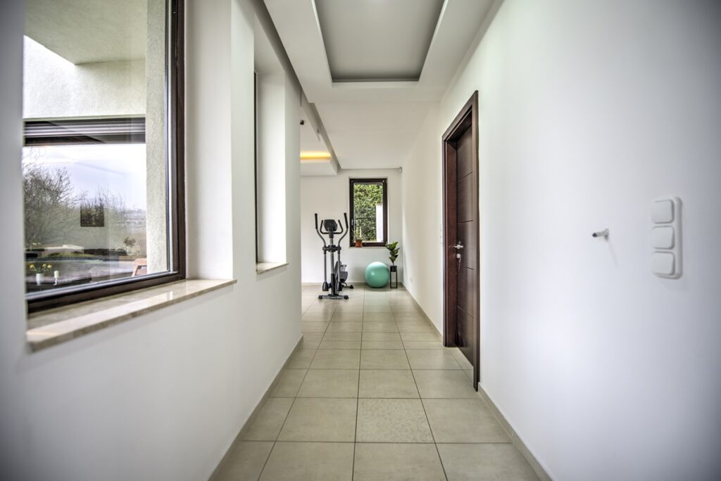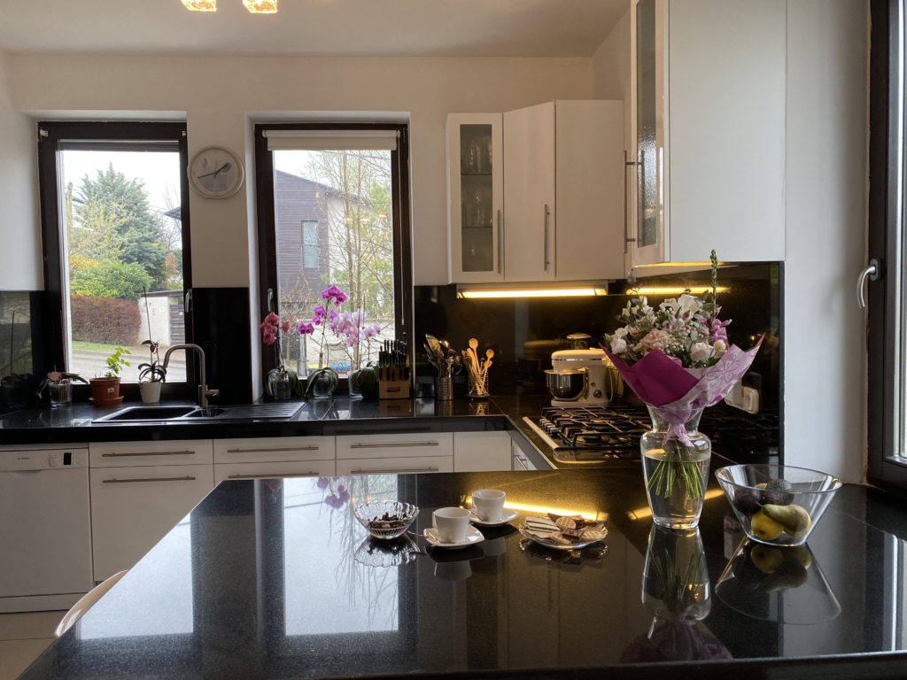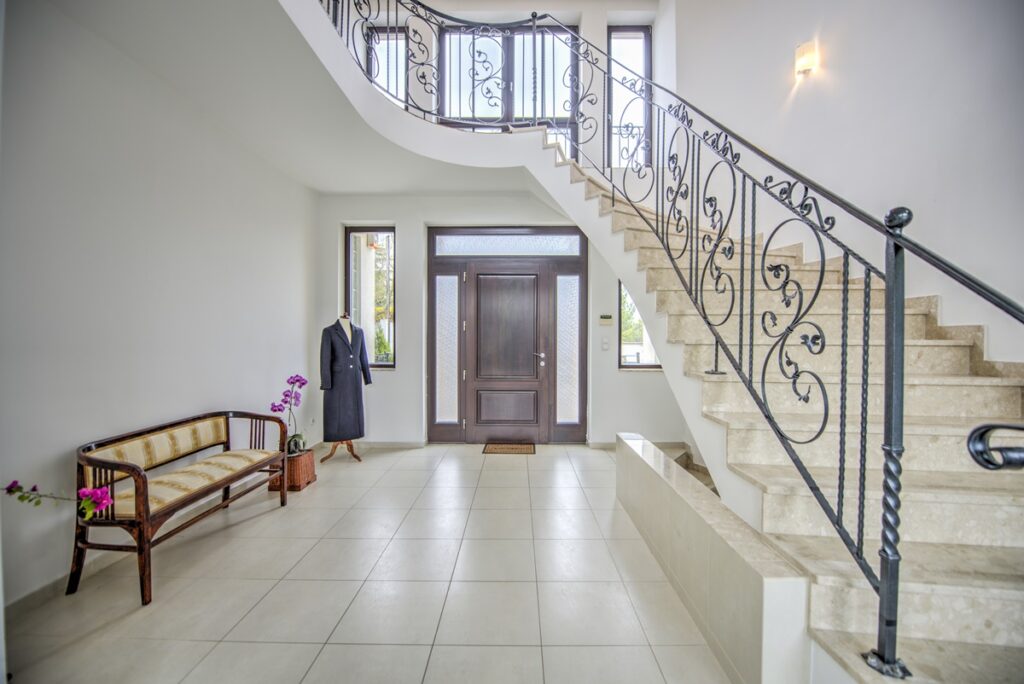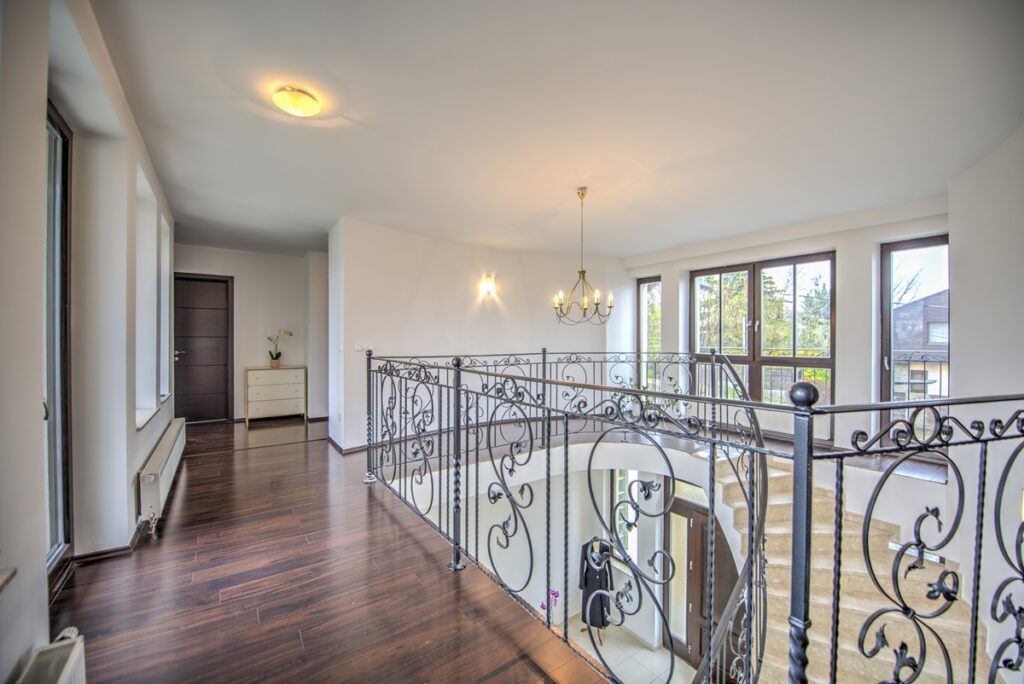 Parter: – 7-metrowy hol. – Eleganckie marmurowe schody z kutą balustradą – Kuchnia z granitowymi blatami – Spiżarnia – Jadalnia – Łazienka – Salon – Pokój gościnny, który również posiada własną łazienkę i toaletę.