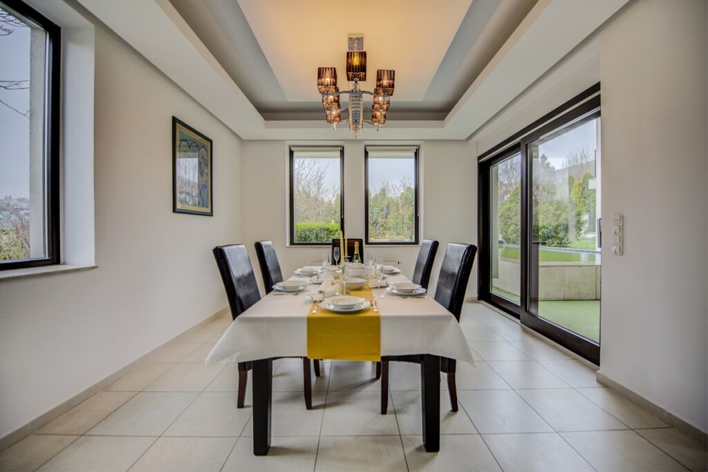 Trójpoziomowa, rodzinna rezydencja w kształcie litery U, stylizowana na pałac wenecki, z basenem, oferuje wiele udogodnień i ekonomiczną eksploatację.