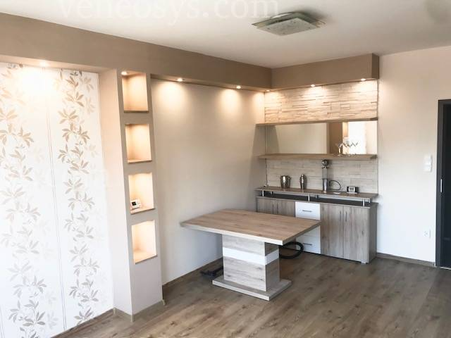 Kuchnia jest wydzielona, ​​ale w każdej chwili można ją połączyć z salonem i przedpokojem, gdyż oddzielona jest ścianą z cegły o grubości 10 cm (ściana działowa).
