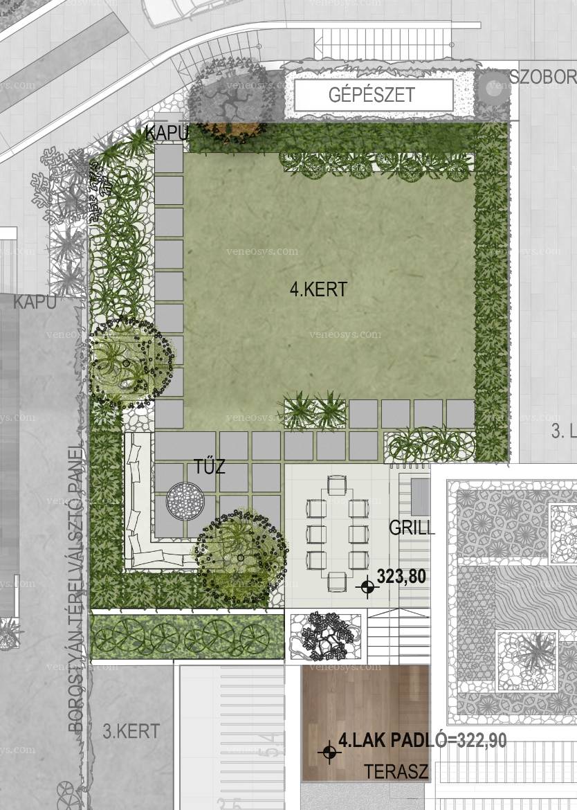 z własną klatką schodową (i windą) oraz zamykanym garażem na dwa samochody oraz monumentalnym widokiem na Budapeszt. Każdy dom jest całkowicie oddzielony od innych. Do mieszkania przynależy również pomieszczenie gospodarcze.